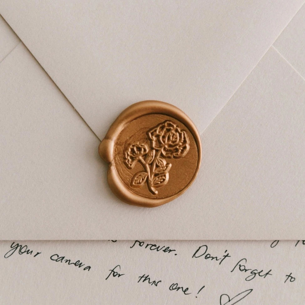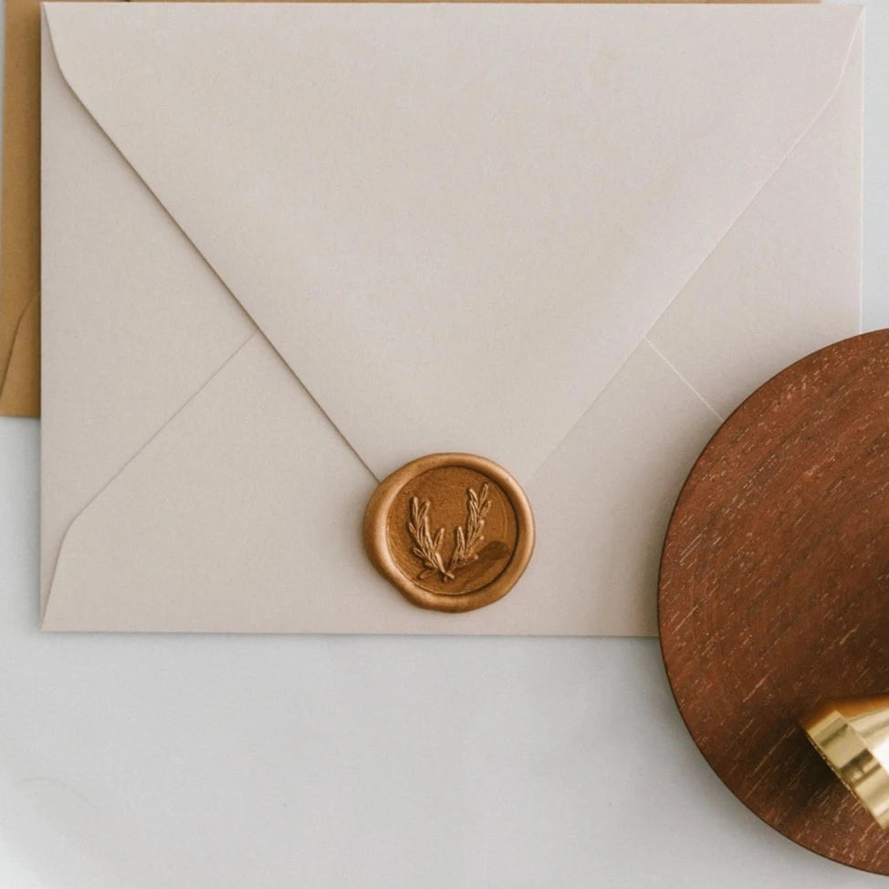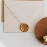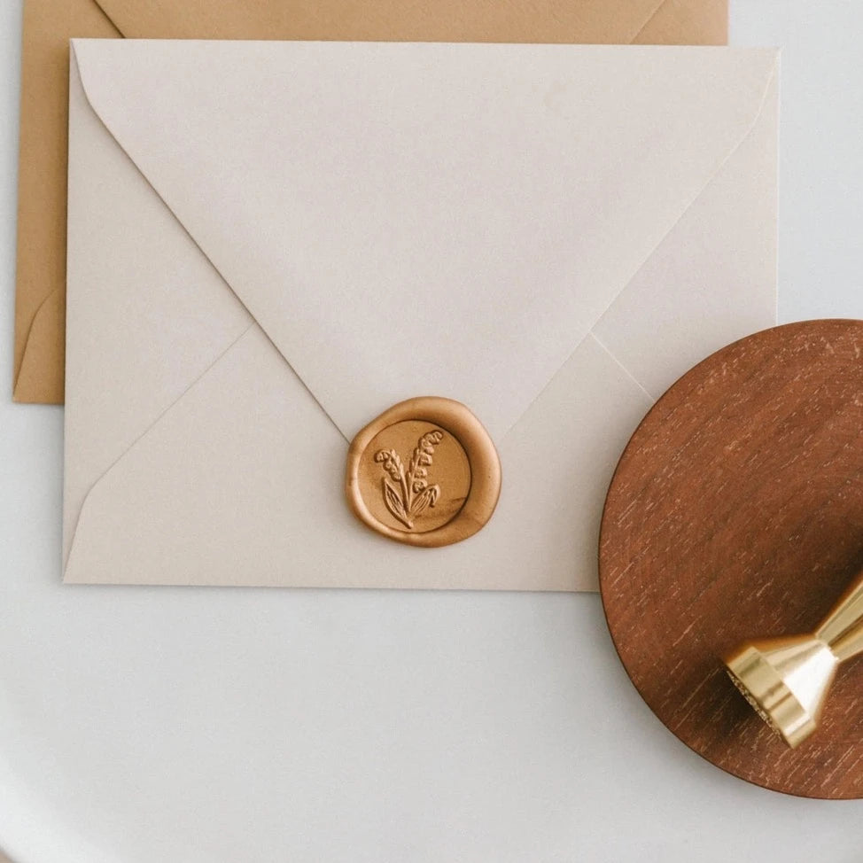 This wax seal set comes in a luxury off-white textured box with a mid-century modern brass seal engraved with an original botanical design, and two gold wax seal sticks.