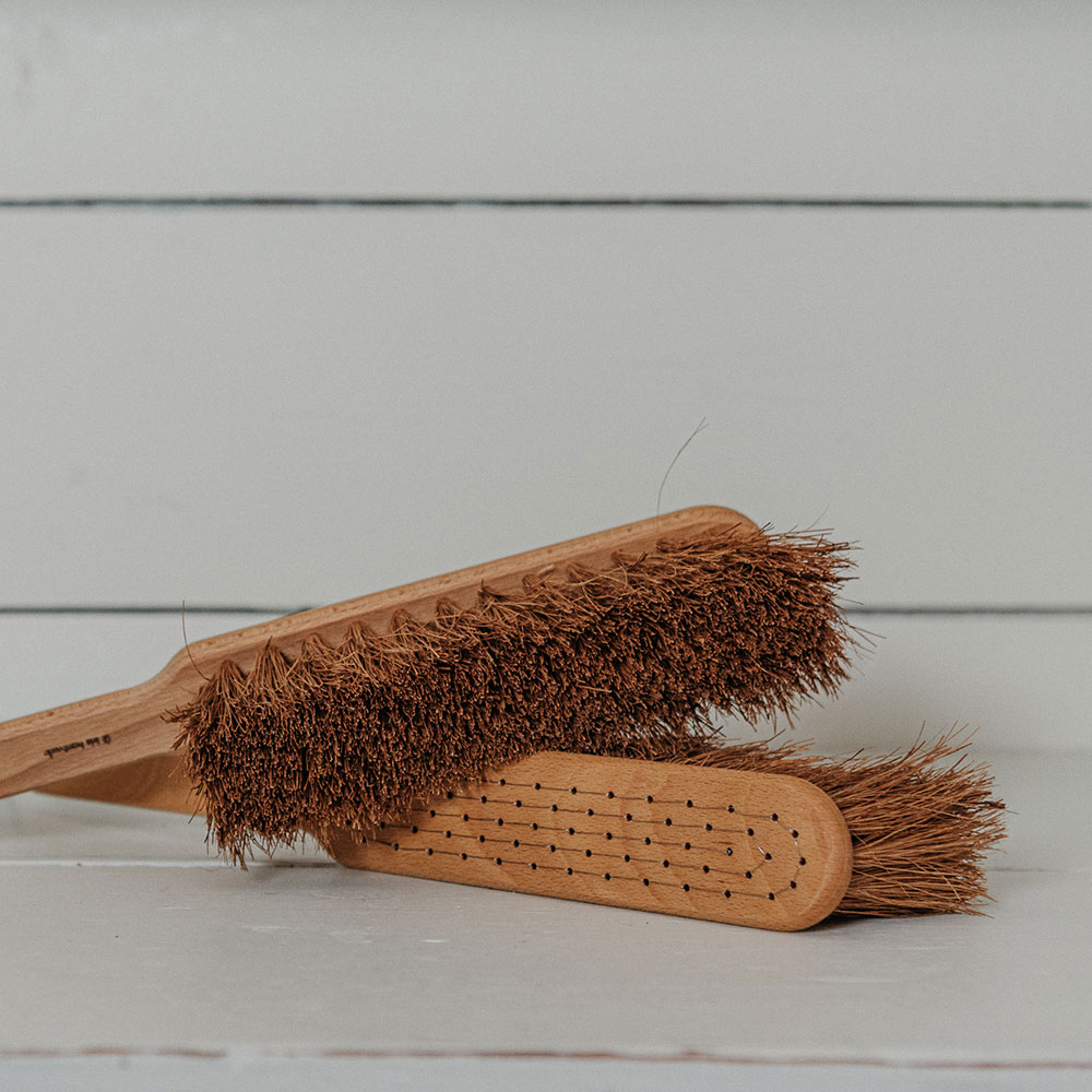 A well finished oil treated beech stocked coconut fibre bristled hand-bound hand broom. Moderately soft for a vegetable fibre brush, and with a lovely wire stitch detail on the back. The bristles are water resistant making these suitable for indoor or outdoor use. From the workshops of Iris Hantverk in Sweden, where visually impaired craftsmen traditionally manufacture natural, functional, and beautiful brushes and accessories.