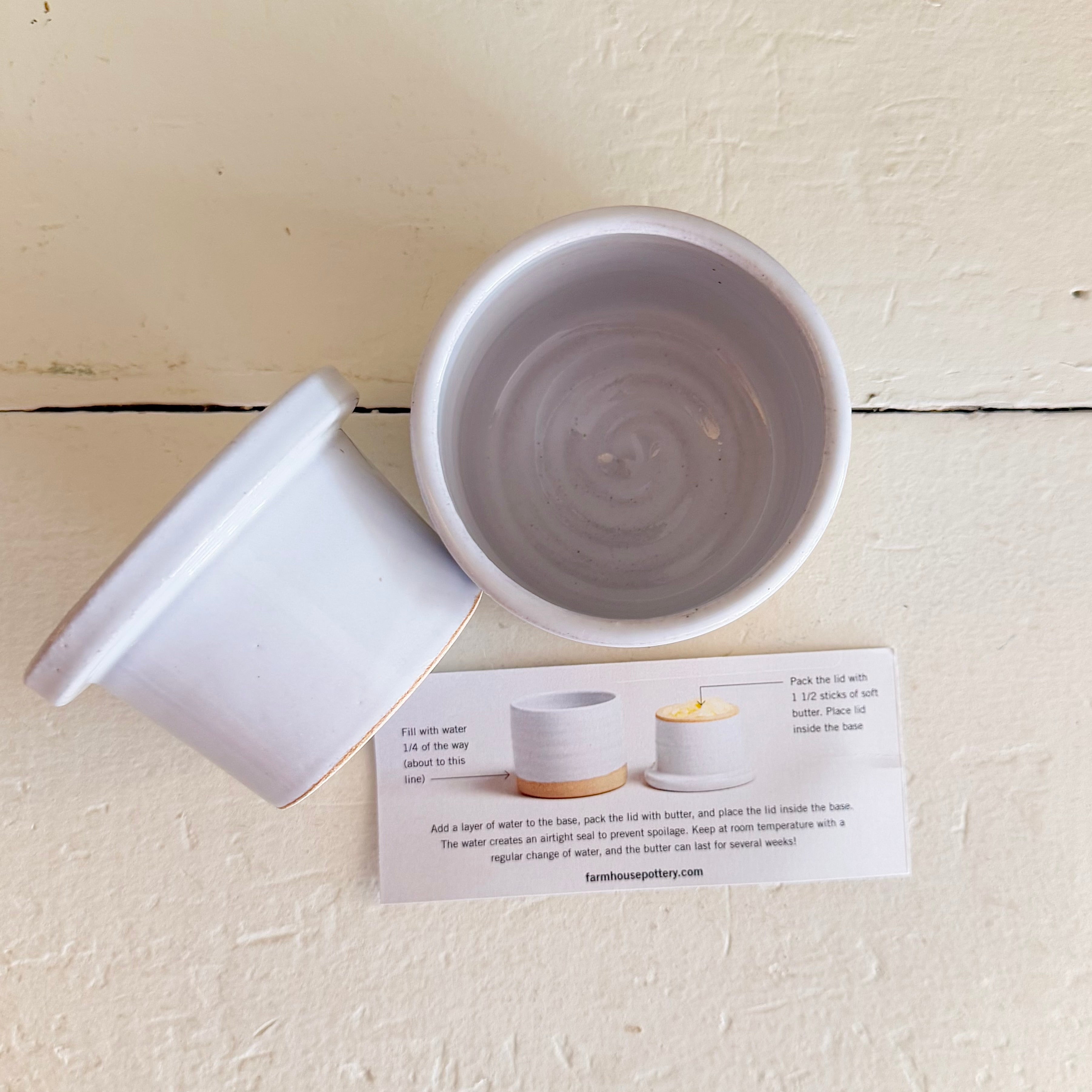 Add a layer of water to the base, pack the lid with butter, and place the lid inside the base. The water creates an airtight seal to prevent spoilage. Keep at room temperature with a regular change of water, and the butter can last for several weeks!