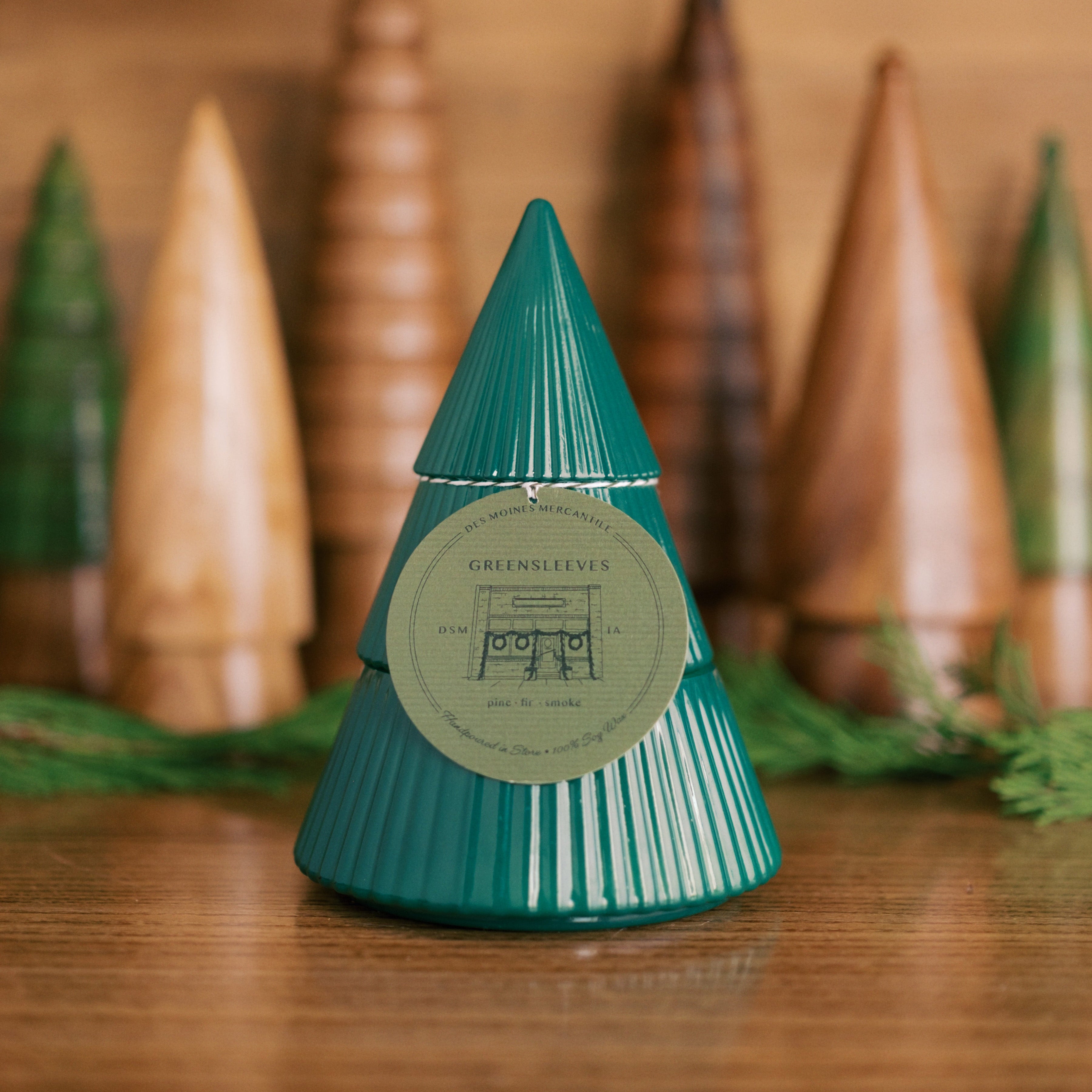 We are so excited to offer our Greensleeves scent in this glass evergreen vessel! It is double wick and 8.5oz. When you burn through this candle, it will make for beautiful decor for years to come!