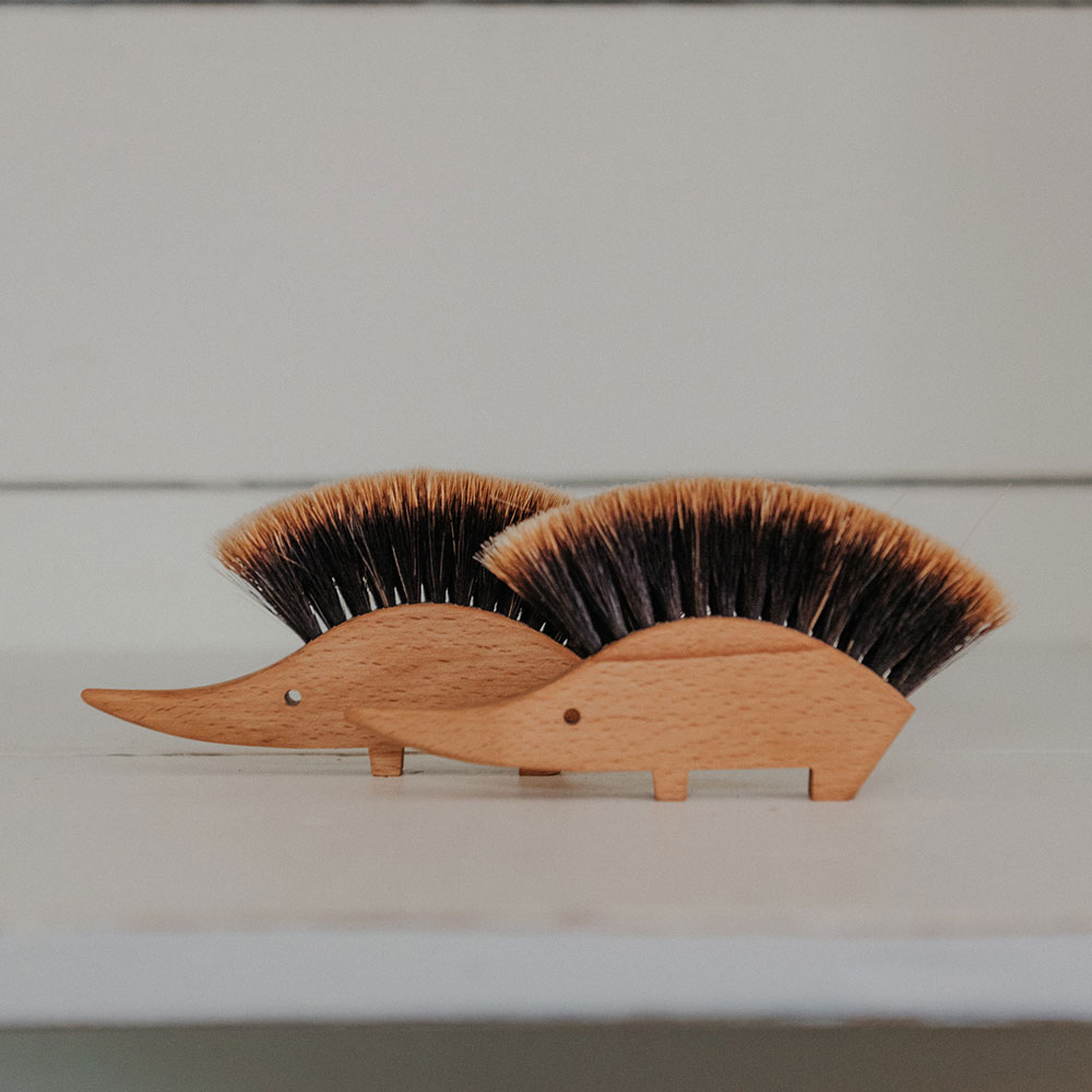 Hedgehog Duster made of oiled beech wood and ombré slotted horse hair or white goat hair. Not only adorable but functional. Keep out on display for a quick table sweep or dusting of fine surfaces. 100% FSC. L 6"; H 2.5". Made in Germany.