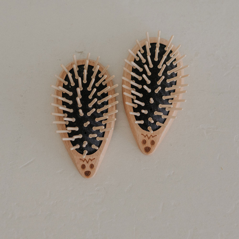 This hedgehog brush is specifically designed for pleasant scalp care no matter your hair texture. This brush's body is hand-crafted from solid beechwood while each maple pin has a waxy, environmentally-friendly coating that glides through knots and tangles. Unlike metal, these pins won't absorb heat, and they have anti-static properties.3 3/4”If dirtied, rinse with lukewarm water, towel blot to remove excess moisture, and air dry with bristles down to prevent handle damage. Do not soak.