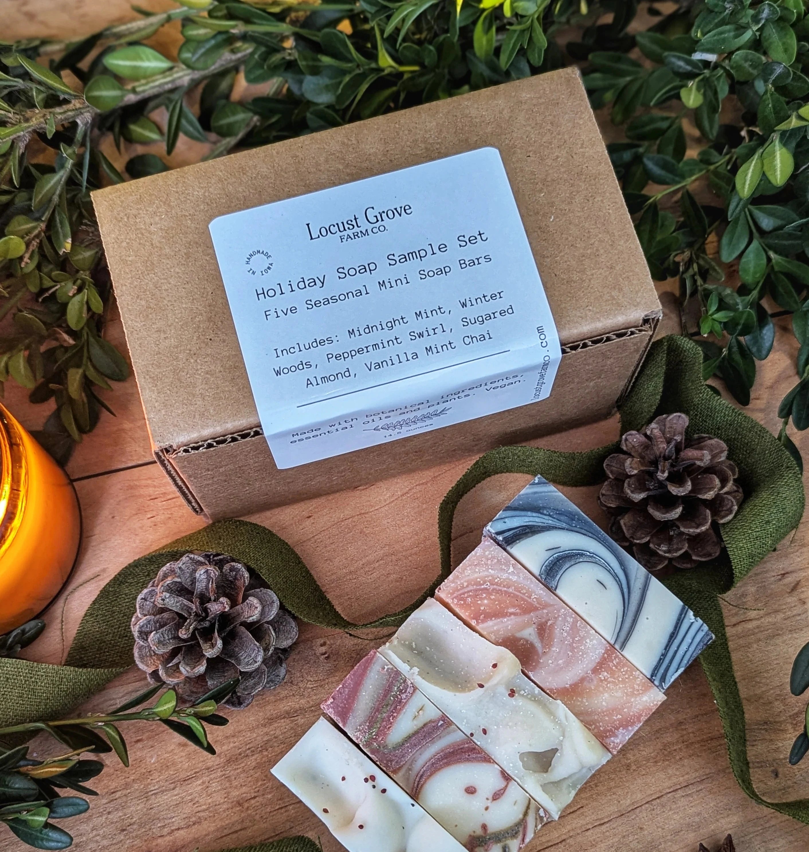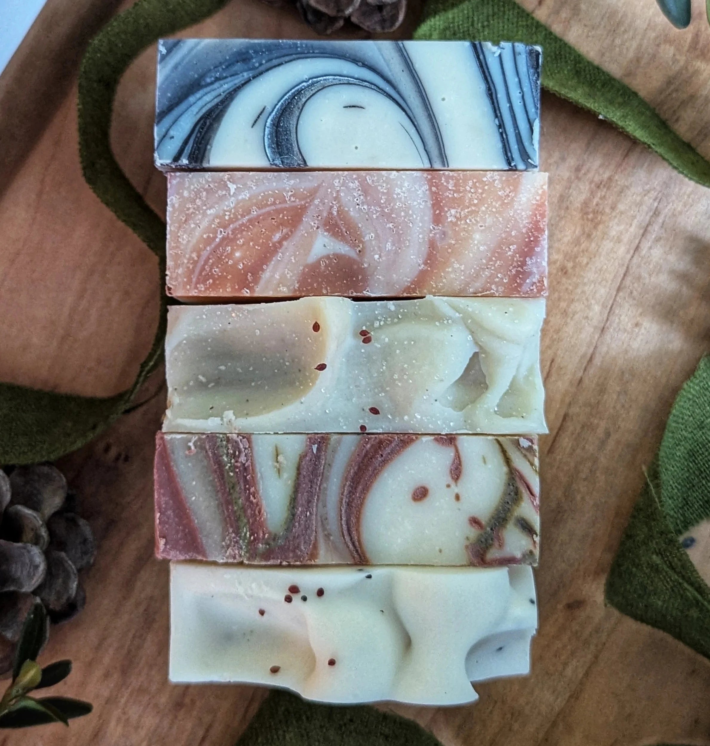 Winter Woods: a delightful walk in the woods without leaving your house! Siberian Fir needle and a hint of lavender creates an aroma that anyone will love. Naturally colored with French green clay, spirulina and spinach powder and topped with poppy and cranberry seeds.