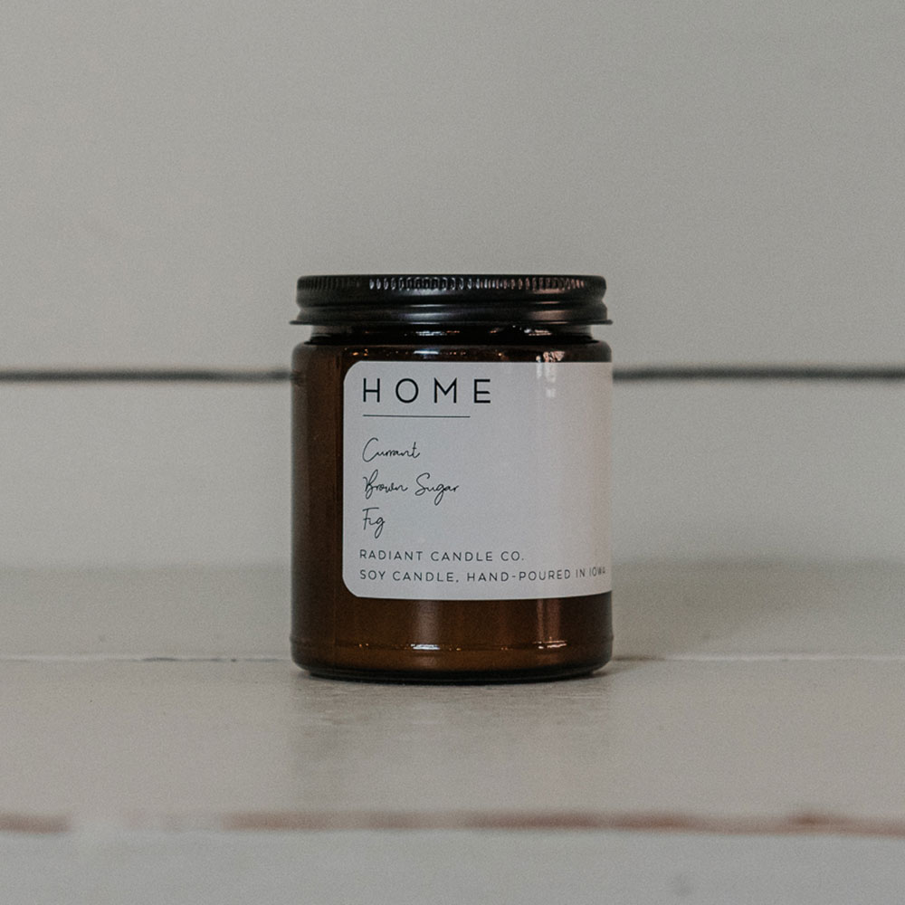 Each of Radiant Candle Co.'s candles are 100% soy wax candles is wicked, poured, and labeled by hand in SE Iowa!