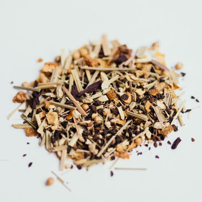 Warm and invigorating, this is an amazing combination. This blend contains roasted chicory root, ginger root, lemongrass, orange peel, lemon essential oil, hibiscus, coriander seed and cinnamon. Paired with the zest of lemon, it makes for a stimulating and soothing blend for daily enjoyment or when your body is needing extra care.