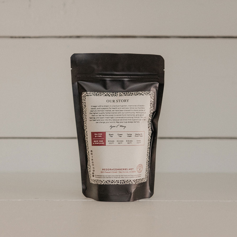 This wonderfully spiced, caffeine free blend is perfect for any time of the day. Warm and invigorating, this tea is just right for when you need a little comforting kick of spice. Contains turmeric, cinnamon, tulsi, ginger, cardamom, cloves and black pepper.