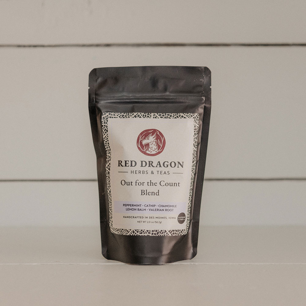 Out For The Count tea is a blend of peppermint, catnip, chamomile, lemon balm and valerian root. This blend is designed with calming sedative herbs to help those who have difficulty shutting their brain down at night. This popular blend is one that many people have come to count on to get a good night’s sleep.